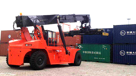 2002年,大連叉車設(shè)計(jì)出45噸正面吊運(yùn)機(jī)并投入生產(chǎn),至今已有13年生產(chǎn)開發(fā)史。CRS450Z5型正面吊運(yùn)機(jī)是專門為20英尺和40英尺國(guó)際集裝箱設(shè)計(jì)的,主要應(yīng)用于集裝箱的堆疊和碼頭、堆場(chǎng)內(nèi)的水平運(yùn)輸,于叉車相比,它具有機(jī)動(dòng)靈活,操作方便,穩(wěn)定性好的特點(diǎn)。CRS450Z5型正面吊運(yùn)機(jī)特別適用于中小港口,鐵路中轉(zhuǎn)站和公路中轉(zhuǎn)站的集裝箱裝卸,也可在大型集裝箱碼頭作為輔助設(shè)備來使用。整車設(shè)計(jì)高標(biāo)準(zhǔn)、高性能,在作業(yè)時(shí)可同時(shí)實(shí)現(xiàn)整車行走、變幅、臂架伸縮動(dòng)作,具有較高的工作效率。原裝沃爾沃或康明斯發(fā)動(dòng)機(jī),燃油消耗低,符合歐Ⅲ排放標(biāo)準(zhǔn),具有全天候易啟動(dòng)的特點(diǎn),保證車輛發(fā)揮其最大功率和最佳效率。變速箱、驅(qū)動(dòng)橋、電器系統(tǒng)控制部分和液壓系統(tǒng)工作油泵、液壓閥塊等主要零部件均采用進(jìn)口高端優(yōu)質(zhì)部件,保證產(chǎn)品質(zhì)量,屬具采用進(jìn)口“ELME”型吊具,設(shè)計(jì)可使用200萬次以上。今年來該產(chǎn)品已經(jīng)服務(wù)于全國(guó)多個(gè)地區(qū)的港口碼頭和鐵路系統(tǒng),并且遠(yuǎn)銷海外,深受國(guó)外客戶的青睞。